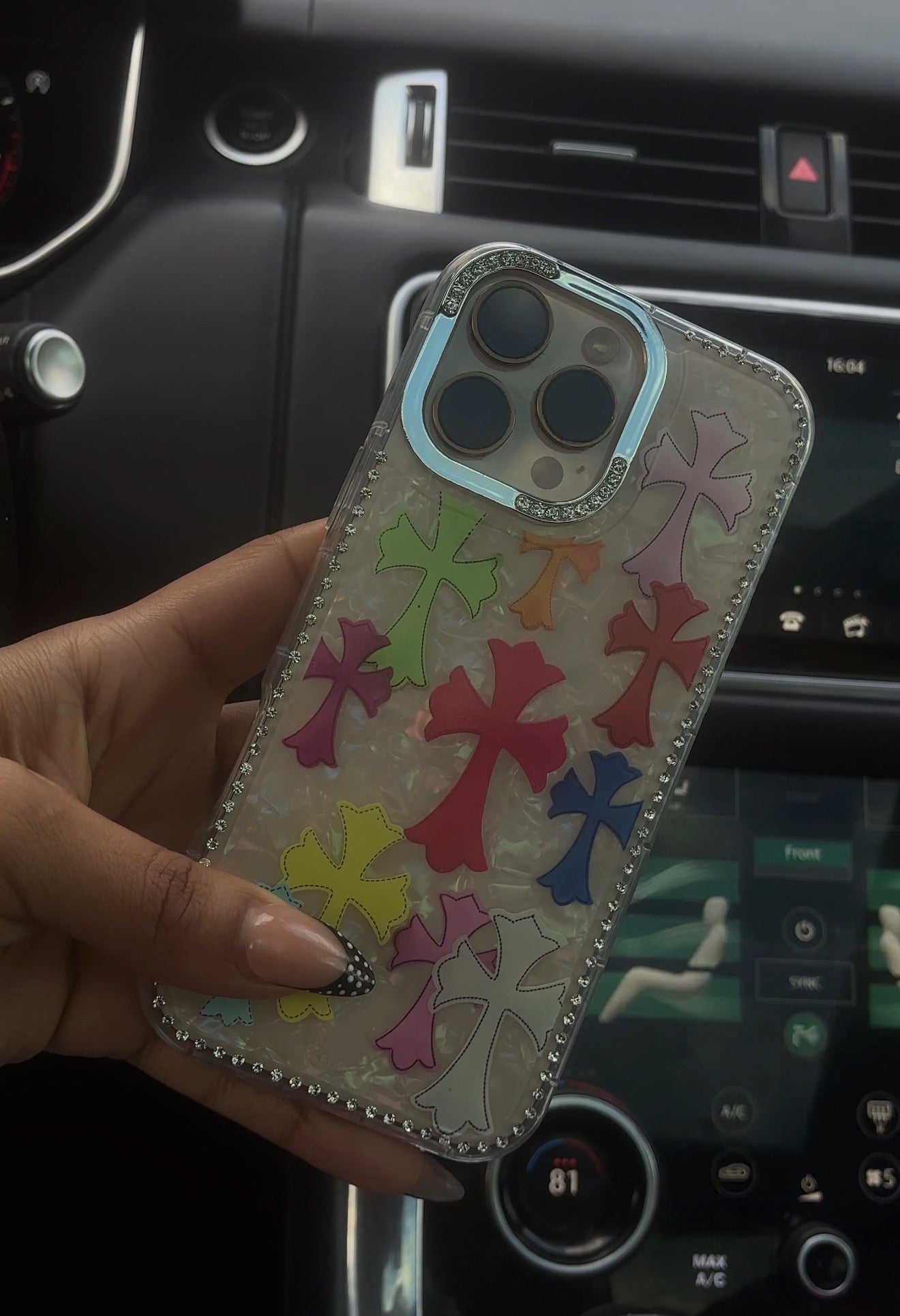 Make a statement with this eye-catching phone case featuring a pearlescent background, colorful design, and crystal-trimmed edges. Finished with a jeweled camera frame for extra sparkle, this case blends bold style with everyday protection.